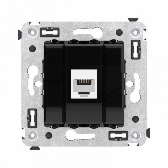 Телефонная розетка RJ-12 без шторки используется для коммутации линий телефонной связи в патч-панелях или для связи телефонных аппаратов с розеткой. Предназначена для скрытого монтажа в стену, поставляется в комплекте с суппортом. Материал – металл, термопласт. Пластиковые детали электроустановочного изделия имеют цвет "Черный квадрат".