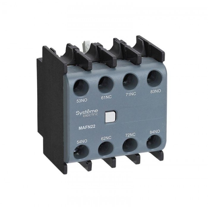 Блок дополнительных контактов для контакторов серии SystemePact MC1G/E; конфигурация 2НО+2НЗ; фронтальный монтаж с помощью винтовых зажимов. Блоки дополнительных контактов применяются совместно с контакторами и предназначены для увеличения количества вспомогательных контактов, использующихся в цепях сигнализации и управления.