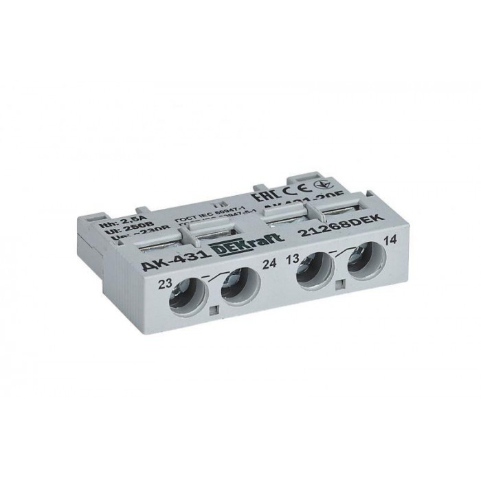 Дополнительные контакты серии ДК-431 F Dekraft; фронтальная установка; кол-во и тип контактов - 2НО; ток терм. стойкости 2,5 А. Дополнительные контакты серии ДК-431 F предназначены для сигнализации о состоянии главных ко...