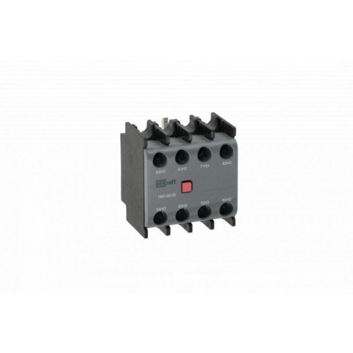 Приставка контактная серии ПКЛ-02-22 для контакторов КМ-102 Dekraft; кол-во контактов - 2НО и 2НЗ; ном.ток 10 А; ном.напряжение до 690 В; установка с лицевой стороны; степень защиты IP20. Приставки контактные предназначены для увеличения количества вспомогательных контактов контактора. Контактные приставки механически соединяются с контакторами и фиксируются при помощи защелки. Приставка подходит для использования с контакторами других производителей.