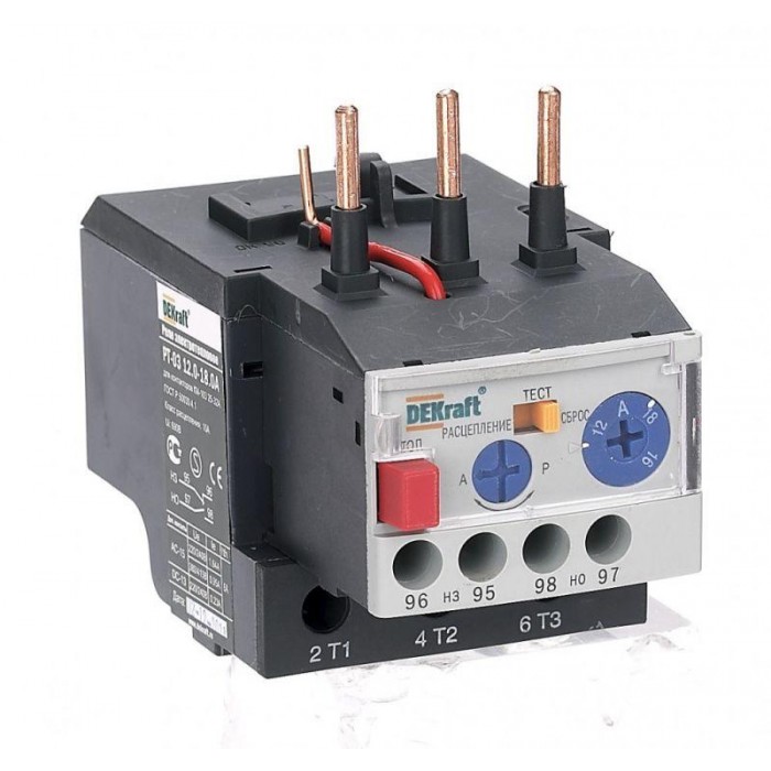 Тепловое реле перегрузки серии РТ-03 Dekraft; предназначено для применения с контакторами КМ-103 на ток 25-32 А; трехполюсное; диапазон уставок реле 12-18 А; класс расцепления 10А; два режима повторного включения - ручной и автоматический. Тепловые реле РТ-03 применяются для защиты цепей переменного тока и электродвигателей от перегрузки, асимметрии фаз, затянутого пуска и заклинивания ротора. Реле подходит к соответствующим контакторам других производителей.