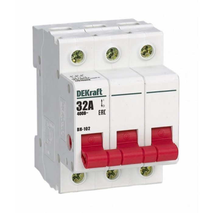 Выключатель-разъединитель серии ВН-102 Dekraft; 3P; номинальный ток 32 А; установка – на DIN-рейку; установочное положение - любое. Выключатели-разъединители применяются для ручного включения/отключения сетей напряжением...