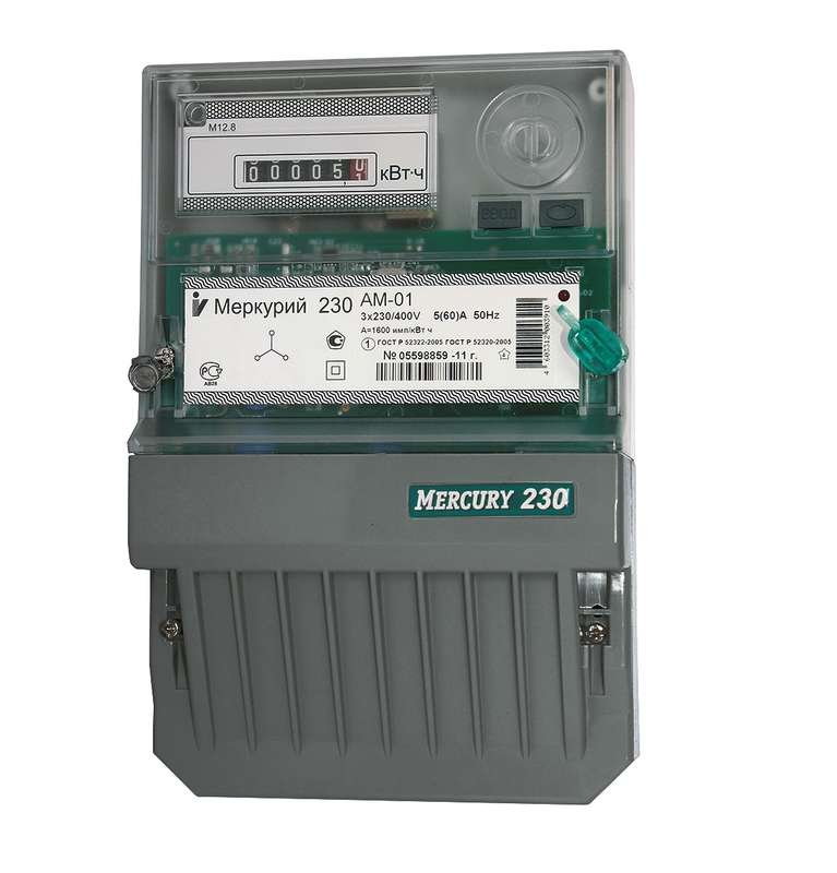 Счетчик Меркурий 230 AM-01 3ф 5-60А класс точн. 1.0 1 тариф. импульс. вых. на панель мех. ОУ Инкотек..