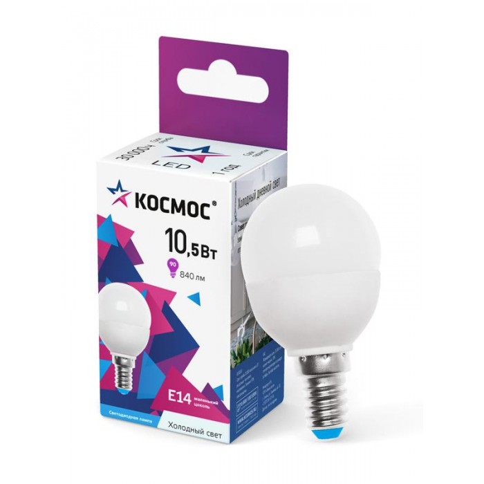 Лампа светодиодная 10.5Вт шар 6500К холод. бел. E14 220В КОСМОС LkeLED10.5wGL45E1465