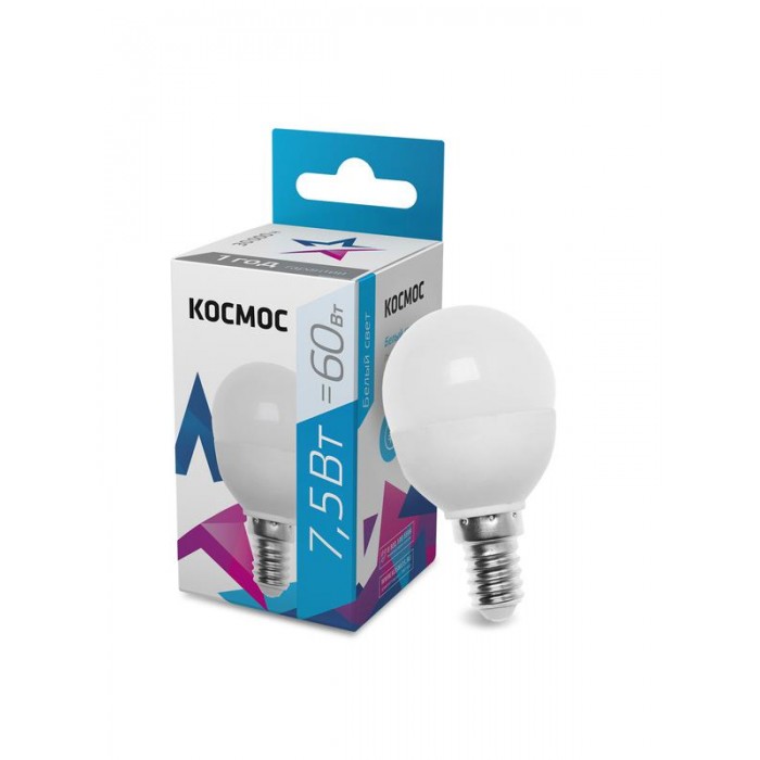Лампа светодиодная 7.5Вт шар 4500К бел. E14 220В КОСМОС LkecLED7.5wGL45E1445