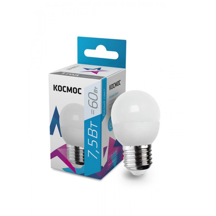 Лампа светодиодная 7.5Вт шар 4500К бел. E27 220В КОСМОС LkecLED7.5wGL45E2745