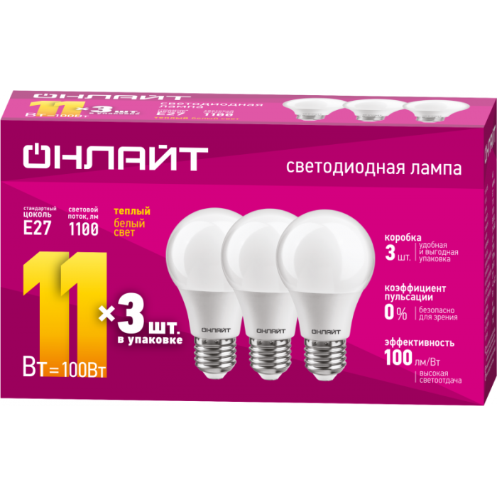Лампа светодиодная 90 602 OLL-A60-11-230-2.7K-E27-PACK3 ОНЛАЙТ 90602