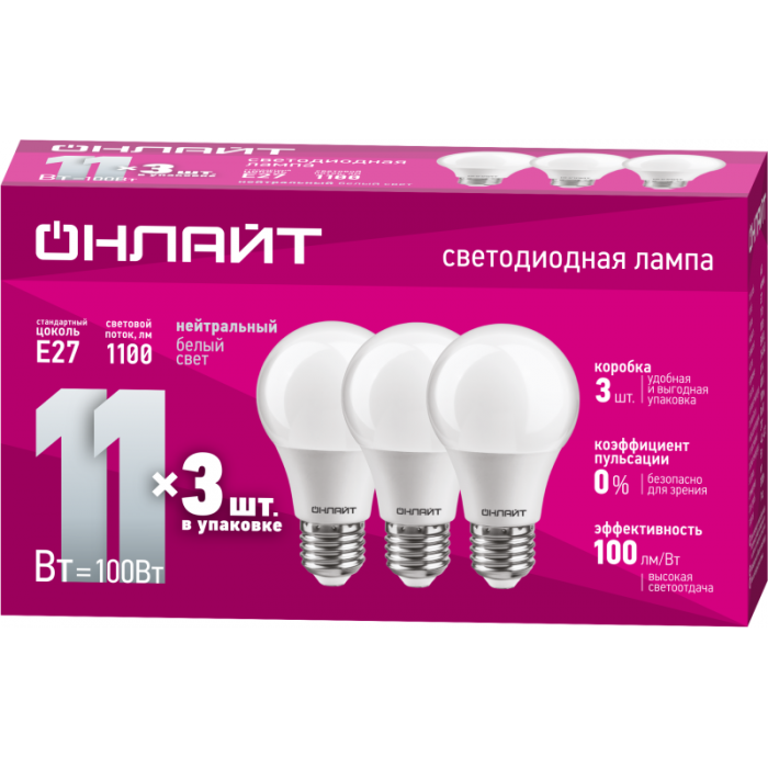 Лампа светодиодная 90 603 OLL-A60-11-230-4K-E27-PACK3 ОНЛАЙТ 90603 1924345