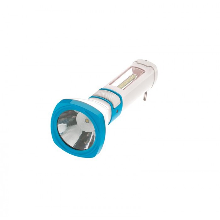 Бытовой фонарик средних размеров 2-в-1 со встроенным светильником на 180 градусов. Встроенна вилка для подзарядки. Совмещает луч фонаря (светит как фара автомобиля, направленный свет с ярким пятном засветки в центре) и широкий свет (освещает широкое пространство с одной стороны, удобен для работы вблизи). Длина луча – 100 м, время беспрерывной работы – до 3 ч. Площадь освещения светильника - 24 кв.м, время беспрерывной работы – до 6 ч. Надежный свинцово-кислотный аккумулятор 4В 1200 мАч, подзарядка от сети с помощью встроенной вилки. Упакован в блистер – фонарь хорошо видно в упаковке.