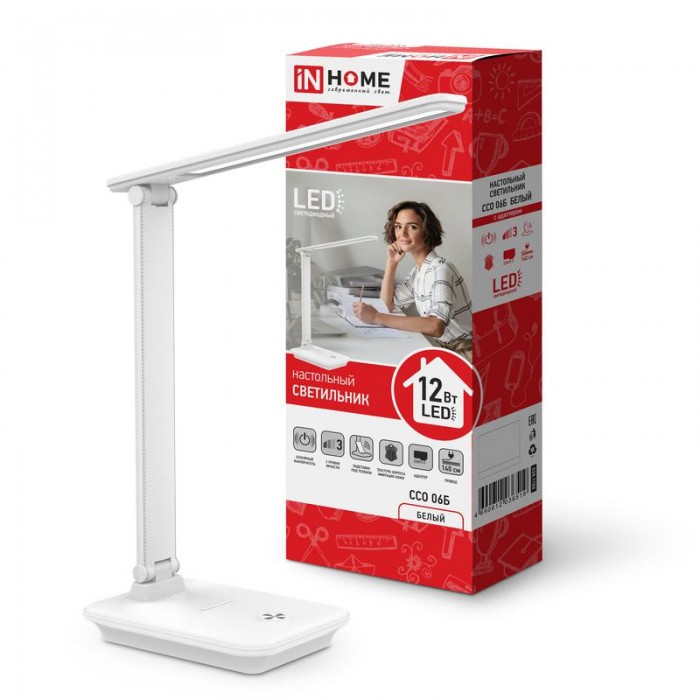 Светильник светодиодный настольный ССО 06Б 12Вт 3000-6500К 600лм сенсор-диммер с подставкой под телефон с адаптером бел. IN HOME 4690612036519