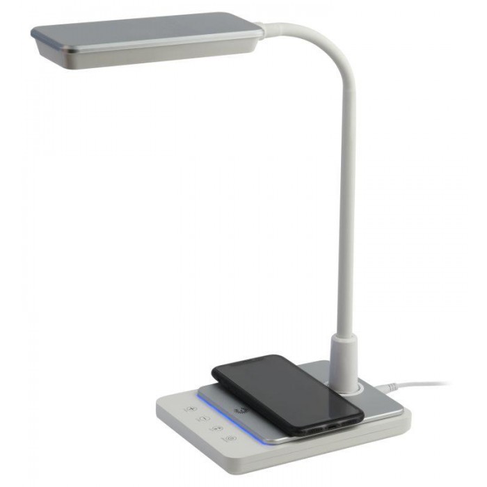 Настольный светильник ЭРА NLED-499-10W-W со светодиодами (LED) в качестве источников света. Оснащен сенсорным управлением с возможностью выбора цветовой температуры (теплый, нейтральный или холодный свет). Плавный диммер для регулировки яркости. Светильник сохраняет выбранные настройки при включении-выключении. Направление света регулируется наклоном и поворотом плафона в любом направлении. Светильник имеет встроенный модуль Qi для беспроводной зарядки мобильных устройств. Просто положите телефон, поддерживающий функцию Qi, на основание светильника в отмеченной зоне - светильник подзарядит его удобно и быстро!