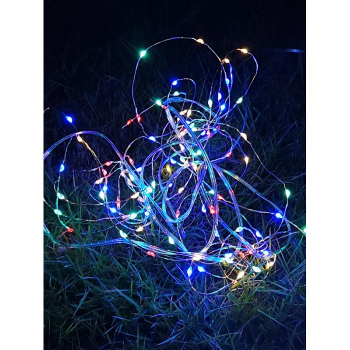 Светодиодная гирлянда из гибкого медного провода "Разноцветные нити" на солнечной батарее. Длина световой части - 4 метра, общая длина - 7 метров 100 светодиодов по 0,03Вт. Общая мощность = 2,4 Вт Цвет свечения - мультик...