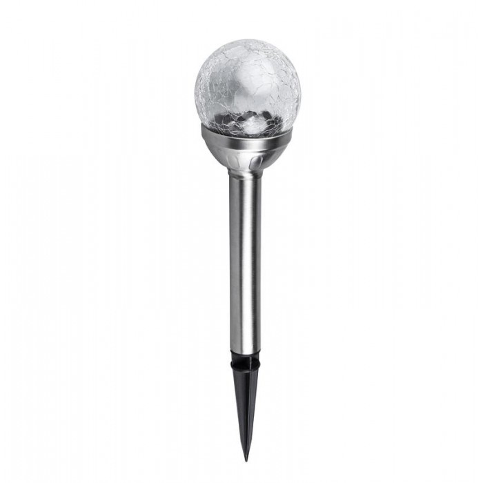 Светодиодный светильник с солнечной батареей, устанавливается в грунт. Предназначен для декоративной подсветки садовых и дачных участков, цветников, дорожек. Автоматическое включение/выключение при наступлении темного/светлого времени суток (датчик освещенности) Цвет свечения: мультицветный (автоматическое изменение цвета) Время непрерывной работы при полностью заряженном аккумуляторе 8 часов. Материал корпуса: нержавеющая сталь, пластик. Плафон отлит по технологии растрескавшегося стекла.