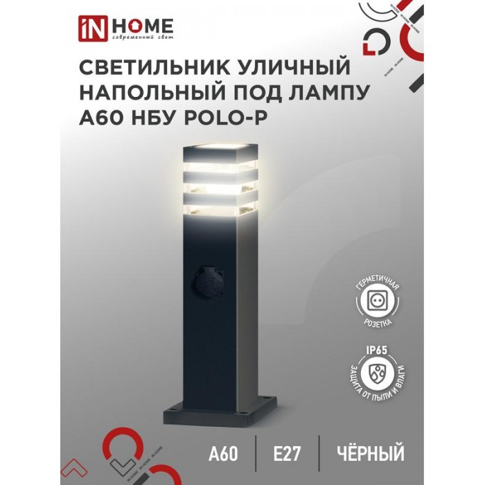 Светильник НБУ POLO-SP600WO-A60-BL E27 IP65 600мм уличный напольн. под лампу A60 с розеткой алюм. черн. IN HOME 4690612051666