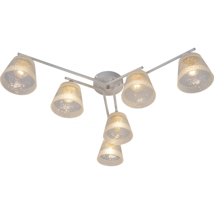 Rivoli Constance (арт. 3155-306) – люстра потолочная под 6 ламп Е27 60 Вт. Люстра в белом цвете идеально подходит для современных интерьеров. В коллекции Constance итальянского бренда Rivoli есть также люстра под 4 лампs – арт. 3155-304. Люстры белые потолочные – настоящий тренд в оформлении жилых пространств. Люстра из металла Constance Rivoli качественно освещает площадь до 18 м2. Такая потолочная люстра хорошо смотрится в небольших жилых комнатах – люстра на кухню, люстра в спальню. Прозрачные стеклянные плафоны люстры имеют красивый рифлёный рисунок и декорированы матовыми полосами.