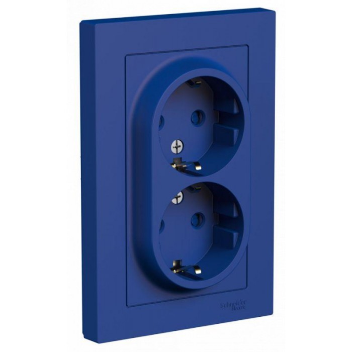 Розетка двойная Systeme Electric (ранее Schneider Electric) серии AtlasDesign (в сборе, цвет аквамарин) с заземлением и шторками подходит для сетей 250 В, на ток 16 А. - Заземляющий контакт обеспечивает дополнительную защиту от удара электрическим током. - Лицевые детали из качественного ABS-пластика, устойчивого к царапинам и УФ-излучению. - Двойная розетка позволяет подключить два устройства в одном месте. - Изделие поставляется в комплекте с рамкой того же цвета.