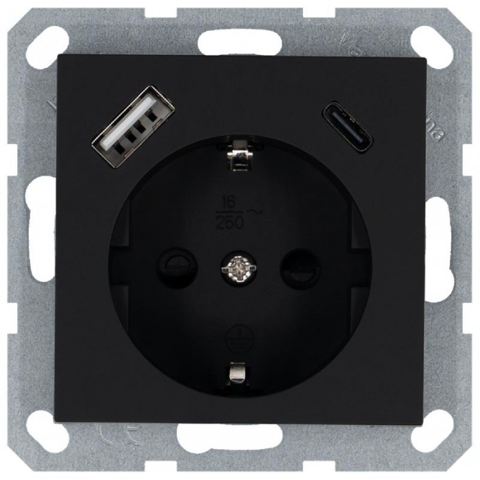 Розетка Shuko 16А с заземл. защ. шторки с 2-мя заряд. устройствами USB тип A+C 25Вт механизм черн. матов. soft touch Jasmart G5501USB-25PB