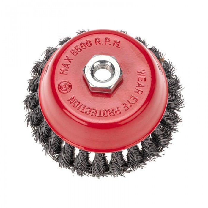 Чашечная щетка KRANZ применяется в составе угловой шлифовальной машины с целью очистки разнообразных металлических деталей и заготовок от слоя краски, лака, заусенцев, ржавчины, окалины или нагара. Подходит для обработки и выравнивания сварочных швов на стальных поверхностях. Прочная закаленная проволока собрана в тугие пучки с расходящимися краями. Такой тип проволоки характеризуется жесткостью, поэтому предназначен для удаления особо сложных загрязнений. Чашечная форма позволяет обрабатывать поверхности с большой площадью, а также обеспечивает улучшенное прилегание и равномерное распределение давления при чистке. Для защиты от коррозии на корпус нанесено эмалевое покрытие, а щетина покрыта маслом. Инструмент подходит для выполнения работ, требующих значительных силовых нагрузок и продолжительного воздействия на загрязненную поверхность. Тип соединения М14 обеспечивает простоту и надежность установки на УШМ.