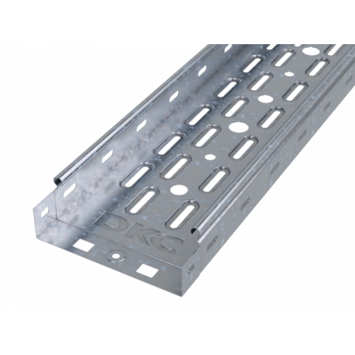 Перфорированные листовые лотки ДКС применяются для прокладки кабеля как в помещении, так и на открытом воздухе. Лотки отличаются высокой несущей способностью – подформовка, производимая при производстве этой продукции, создает дополнительное ребро жесткости, что увеличивает несущую способность системы до 54%. Перфорация сокращает вес конструкции. В лотках имеются отверстия для отвода кабеля диаметром 11 мм, 17 мм, 21 мм. Степень пыле- и влагозащиты перфорированных лотков – IP 10 при использовании крышек, входящих в состав системы. Метод соединения "мама-папа" применяемый для системы, существенно сокращает время монтажа и создает непрерывный контур. Конструктив листовых лотков ДКС предупреждает повреждение кабеля при прокладке. Толщина стали – 0,7 мм, высота лотка – 50 мм, ширина – 150 мм, длина – 3000 мм. Полезное сечение – 7400 мм. Исполнение – "сталь, оцинкованная по методу Сендзимира".