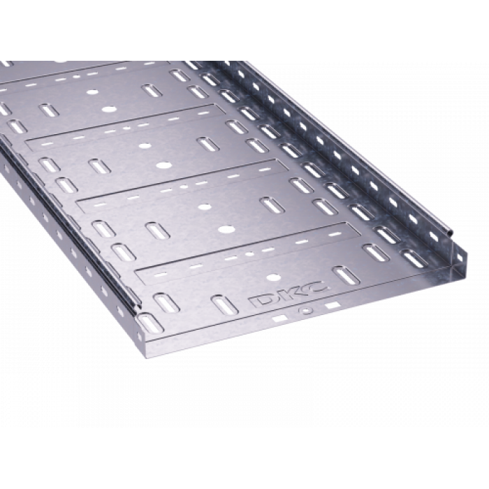 Перфорированные листовые лотки ДКС применяются для прокладки кабеля как в помещении, так и на открытом воздухе. Лотки отличаются высокой несущей способностью – подформовка, производимая при производстве этой продукции, создает дополнительное ребро жесткости, что увеличивает несущую способность системы до 54%. Перфорация сокращает вес конструкции. В лотках имеются отверстия для отвода кабеля. Степень пыле- и влагозащиты перфорированных лотков – IP 10 при использовании крышек, входящих в состав системы. Метод соединения "мама-папа" применяемый для системы, существенно сокращает время монтажа и создает непрерывный контур. Конструктив листовых лотков ДКС предупреждает повреждение кабеля при прокладке. Высота лотка – 50 мм, ширина – 400 мм, длина – 3000 мм, толщина - 1 мм. Лотки в специальном исполнении "Горячий цинк" отличаются повышенной стойкостью к коррозии и воздействию агрессивных сред.