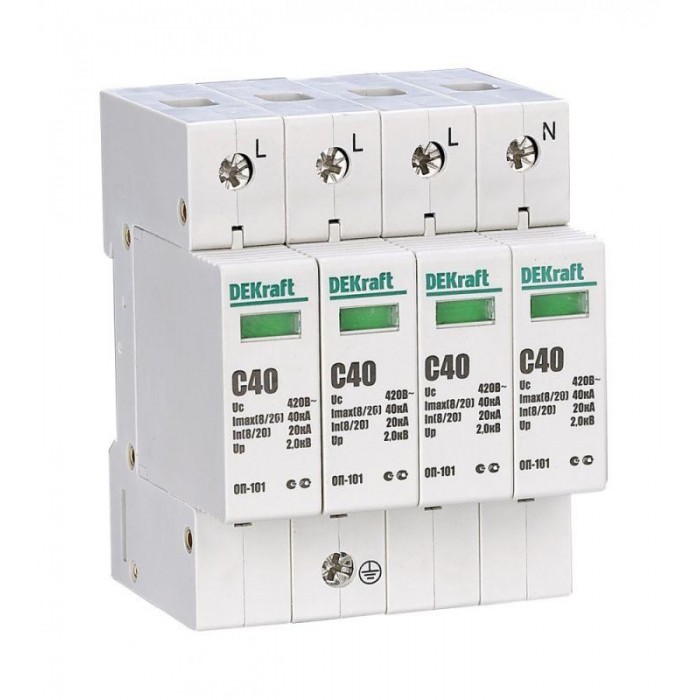 Ограничитель перенапряжения серии ОП-101 Dekraft ; 4P; макс.разрядный ток 40 кА; мак.рабочее напряжение 440 В; класс 2(C); монтаж – на DIN-рейку; ширина – 4 мод. х 18 мм. Ограничители срабатывают за миллиардную долю секу...