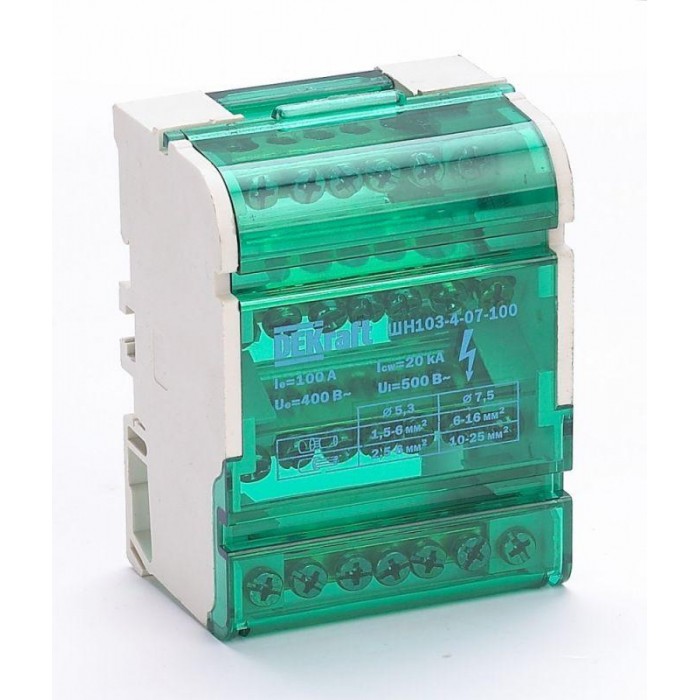Кросс-модуль серии ШН-103 Dekraft; номинальный ток - 100 А; исполнение – 4 ряда по 7 отверстий (5х5,3 + 2x7,5); материал корпуса – нагревостойкий пластик; материал шин – высококачественная электротехническая бронза; каждая шина отдельно изолирована; цвет крышки – зеленый; установка – на DIN-рейку 35 мм или на монтажную панель двумя винтами M4; степень защиты - IP20. Применение кросс-модулей в щите обеспечивает компактную разводку кабелей и защиту от прикосновения к токоведущим частям.