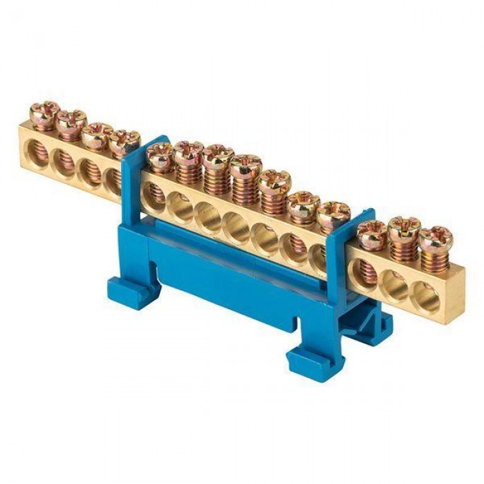 Шина нулевая N 6х9 14 отверстий синий изолятор тип "Стойка" на DIN-рейку латунь розн. стикер PROxima EKF sn0-63-14-sb-r